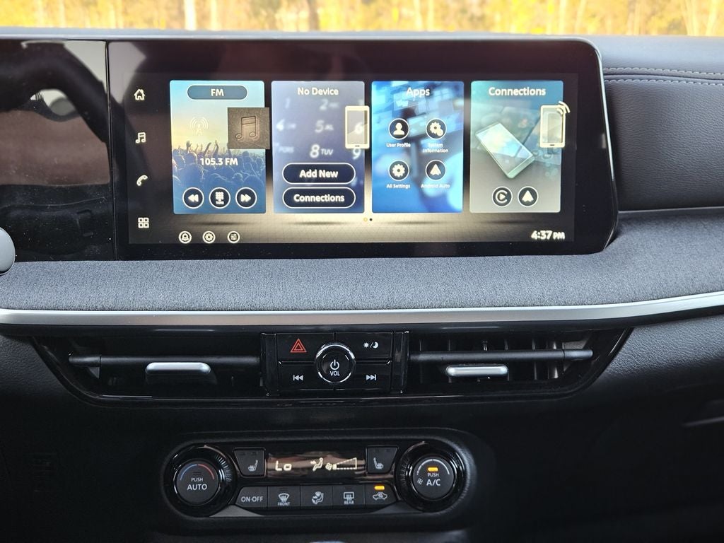 - Radio: AM/FM/SiriusXM Audio System -inc: 12.3" color touchscreen display w/4 speakers, Bluetooth® hands-free phone system, streaming audio via Bluetooth®, NissanConnect featuring wireless Apple CarPlay, wireless Android Auto, Siri eyes free and hands-free text messaging assistant, audio and Bluetooth® steering wheel switches