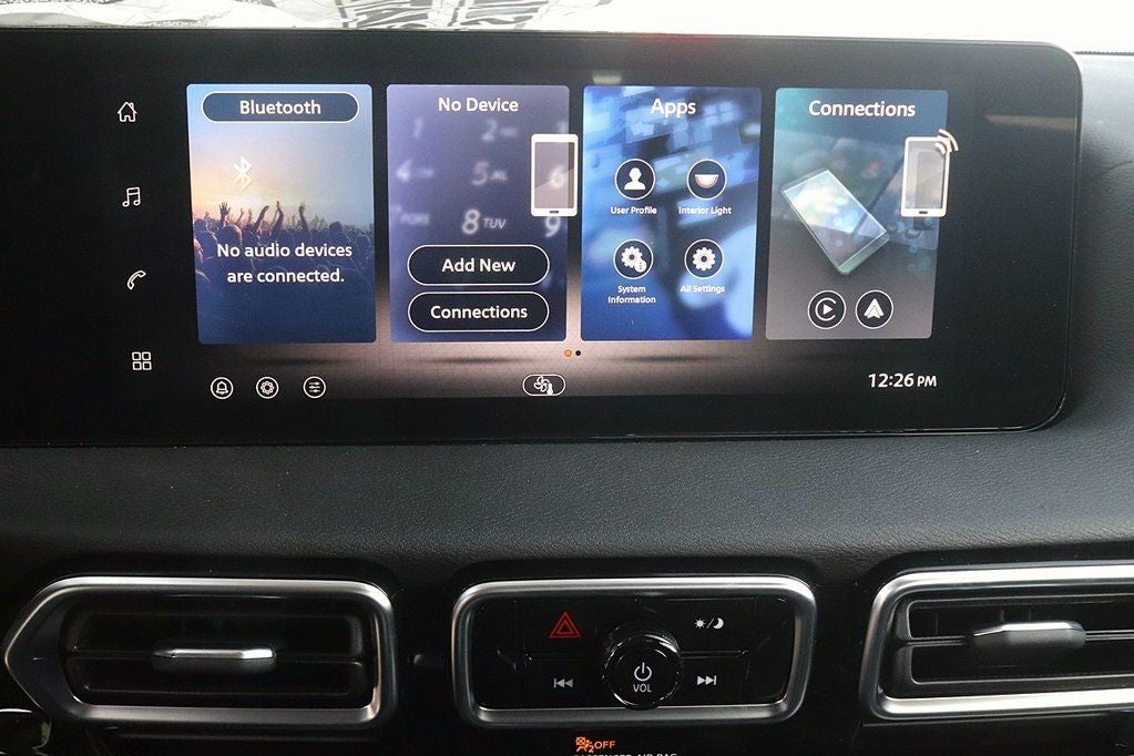 • Radio: AM/FM w/RDS/MP3 -inc: 4 speakers, 12.3" NissanConnect multimedia center display, Bluetooth® hands-free phone system, streaming audio via Bluetooth®, hands-free text messaging assistant, Siri Eyes Free, Google Assistant voice recognition, wireless Apple CarPlay and Android Auto and (2) front USB connection port (type C)
